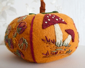 Oranje vilt, geborduurd met garen in verlopende kleuren en paddenstoelen.