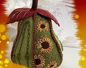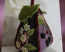 pakket peer. twee kleuren groen vilt, donkerrode bladeren. geborduurd met geel, bruin, groen en rood. 12 x 8 cm. Prijs 15 euro.