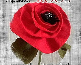 ROOD. een vilten roos maken. bloem ong. 10 cm. doorsnee. steel 35 cm. lang. groene blaadjes
